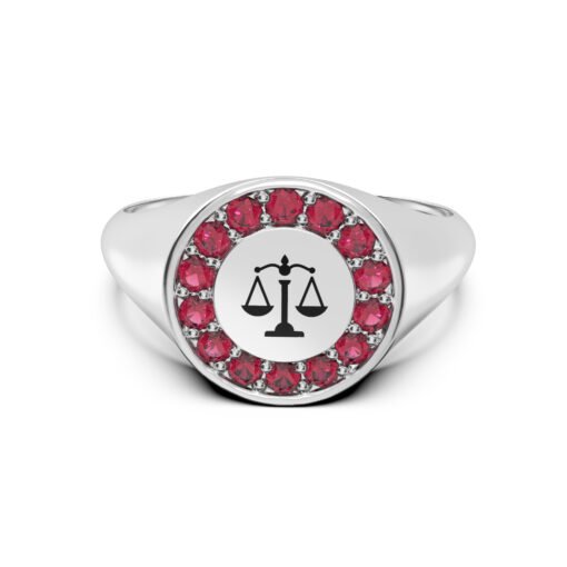Cravado com rubis, pedra preciosa conhecida por sua beleza e significado, o anel simboliza paixão, coragem e vitalidade. Cursos como Direito e Jornalismo são tradicionalmente representados pelo rubi, uma escolha que reflete a determinação e liderança.